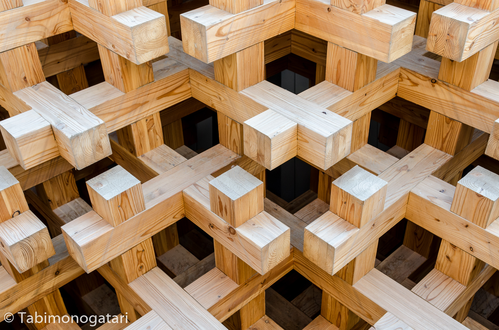 Around the building there was already a long queue. Although it was hot, we decided to endure it and hoped that the queue would move quickly as the admission was scheduled to start in ten minutes. Of course, we were too naïve, the only people entering for some time were VIP who were invited though a passage right in front of where we stood. Half an hour later we found ourselves at the beginning of the real queue with a sign indicating a waiting time of another two hours from there. While waiting we had plenty of time to admire the outer structure, built from interlaced wooden bars completely free from screws or nails.