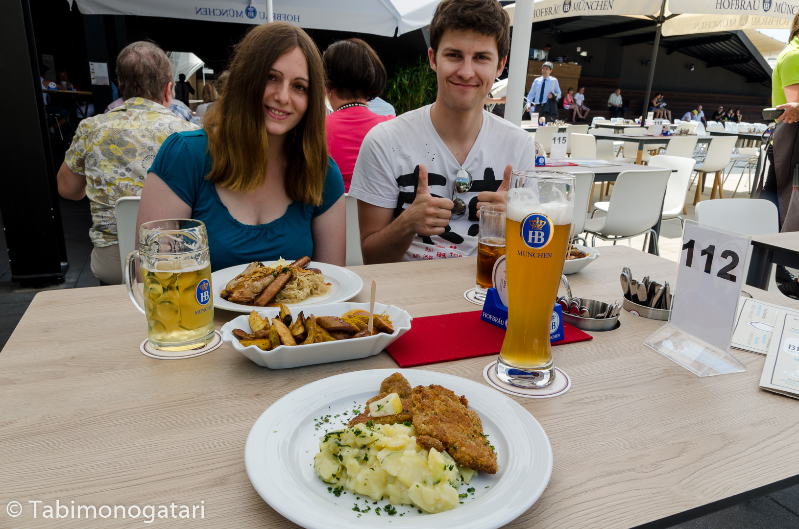 The roof was built to serve as a walkable deck with information panels about the sixteen states. The queue leading to the inner building discouraged us a bit, so we settled with lunch in the Bavarian restaurant in the shade instead. When looking through the menu I was quite delighted as there were several typical German dishes listed that I did not have for some time. We chose Hofbräu beer to go with Currywurst and a Sauerkraut platter. In that moment I noticed again that wheat beer and „Radler“ are rarely on the menu in Switzerland. And I miss the potato salad of southern Germany, the one without mayonnaise.