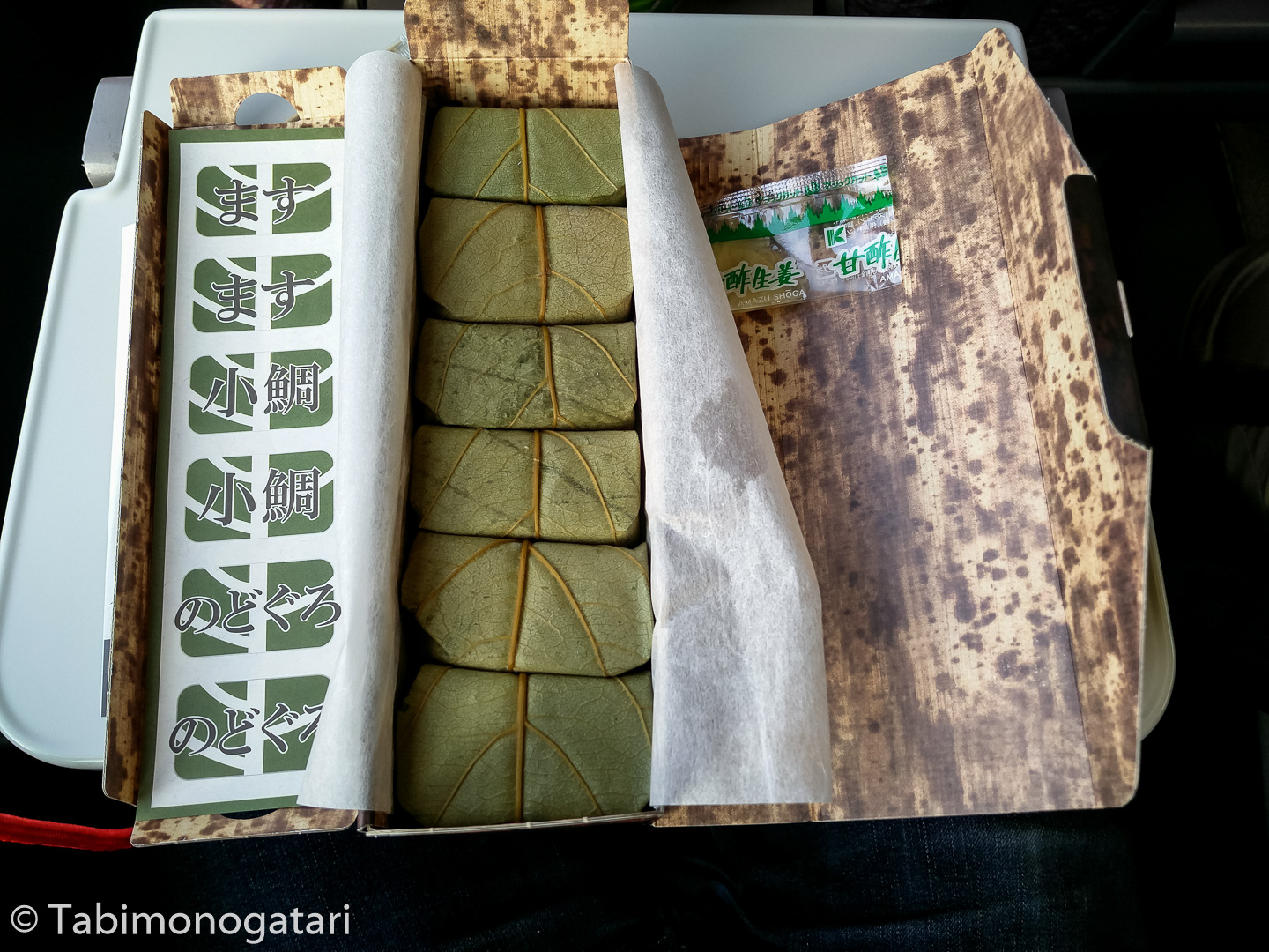 A few minutes later everything returned to its normal state. Feeling hungry I opened the sushi eki-ben which contained snapper (tai), salmon and yuzu. The individual pieces were wrapped into leaves which gave a pleasant presentation. Each piece tasted good and especially the snapper was heavenly.