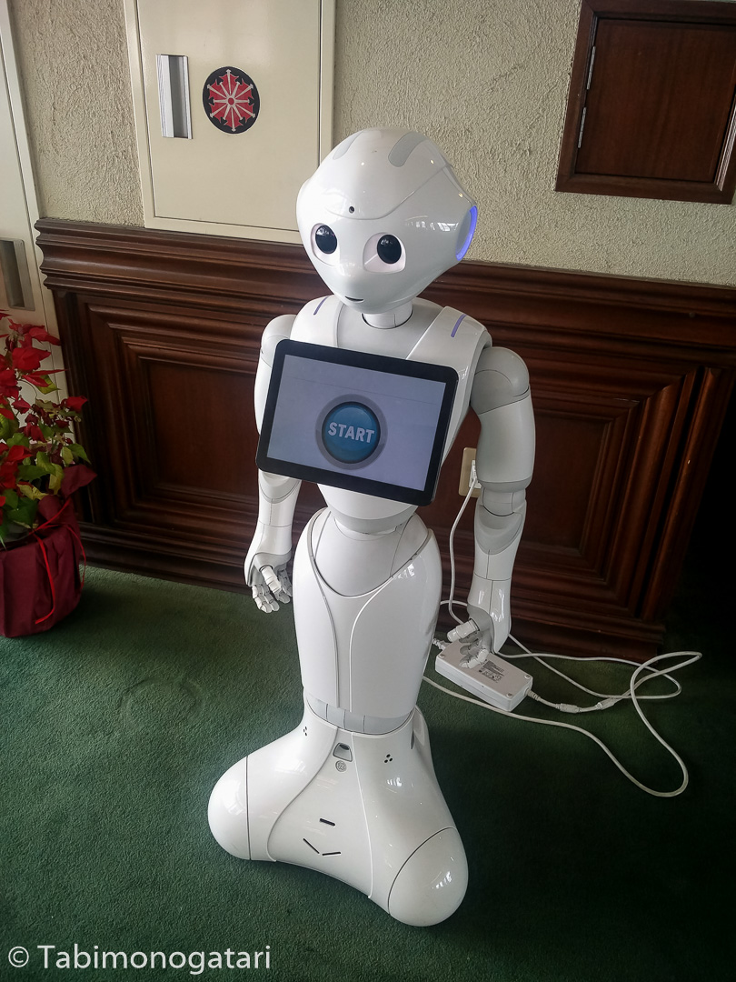 We reserved a room in the Ichii ryokan, situated directly in front of the Yubatake. In the lobby Pepper invited us to a chat.