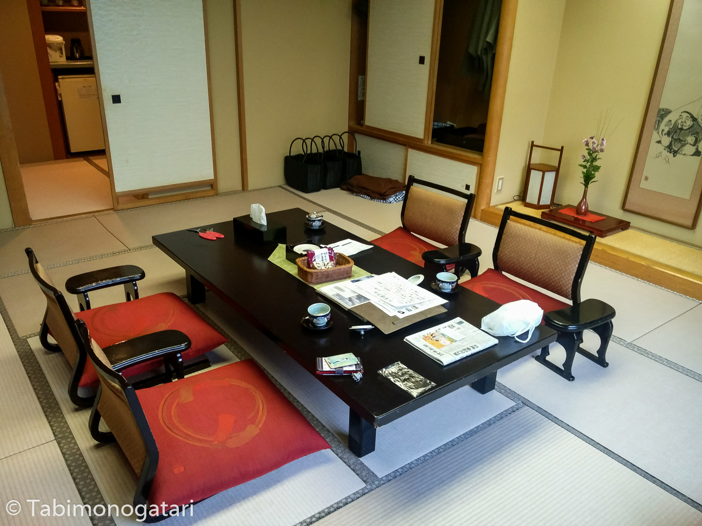 The Japanese-style tatami room easily fitted six people, even though we reserved it for three. The interior was pleasing and the view outside gorgeous. At the table we were introduced to the amenities and services and informed about dinner time. Lastly, we were served green tea and a sweet.