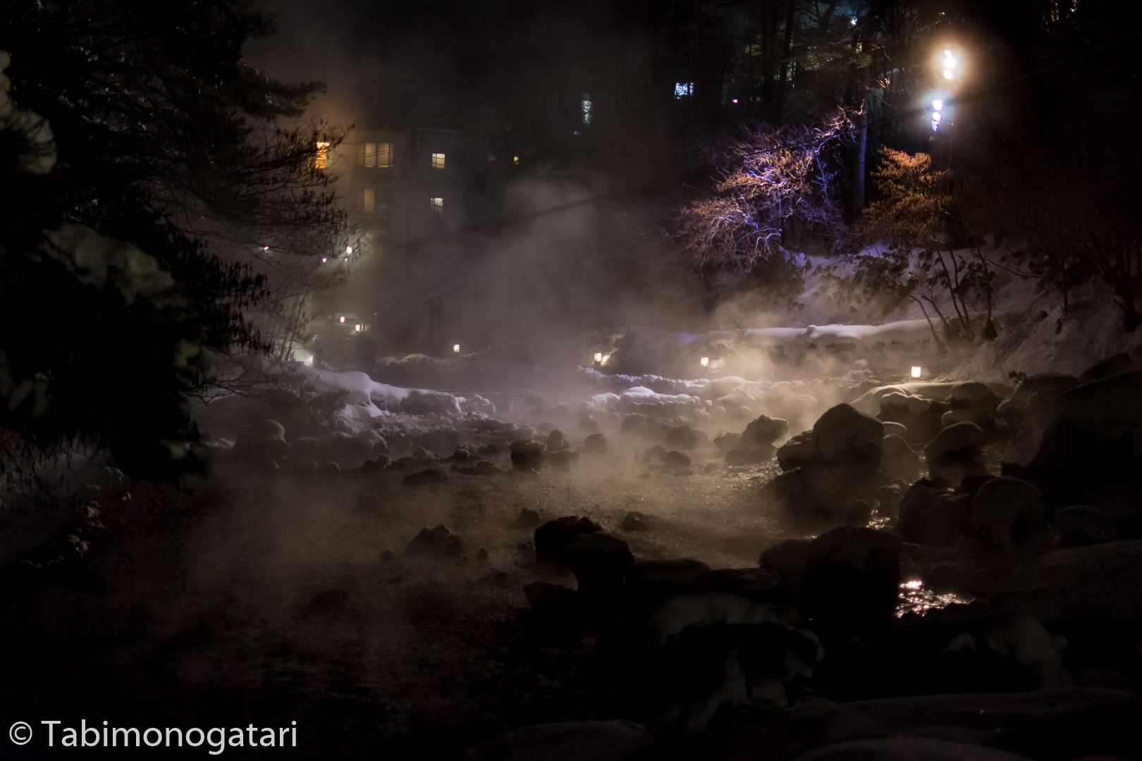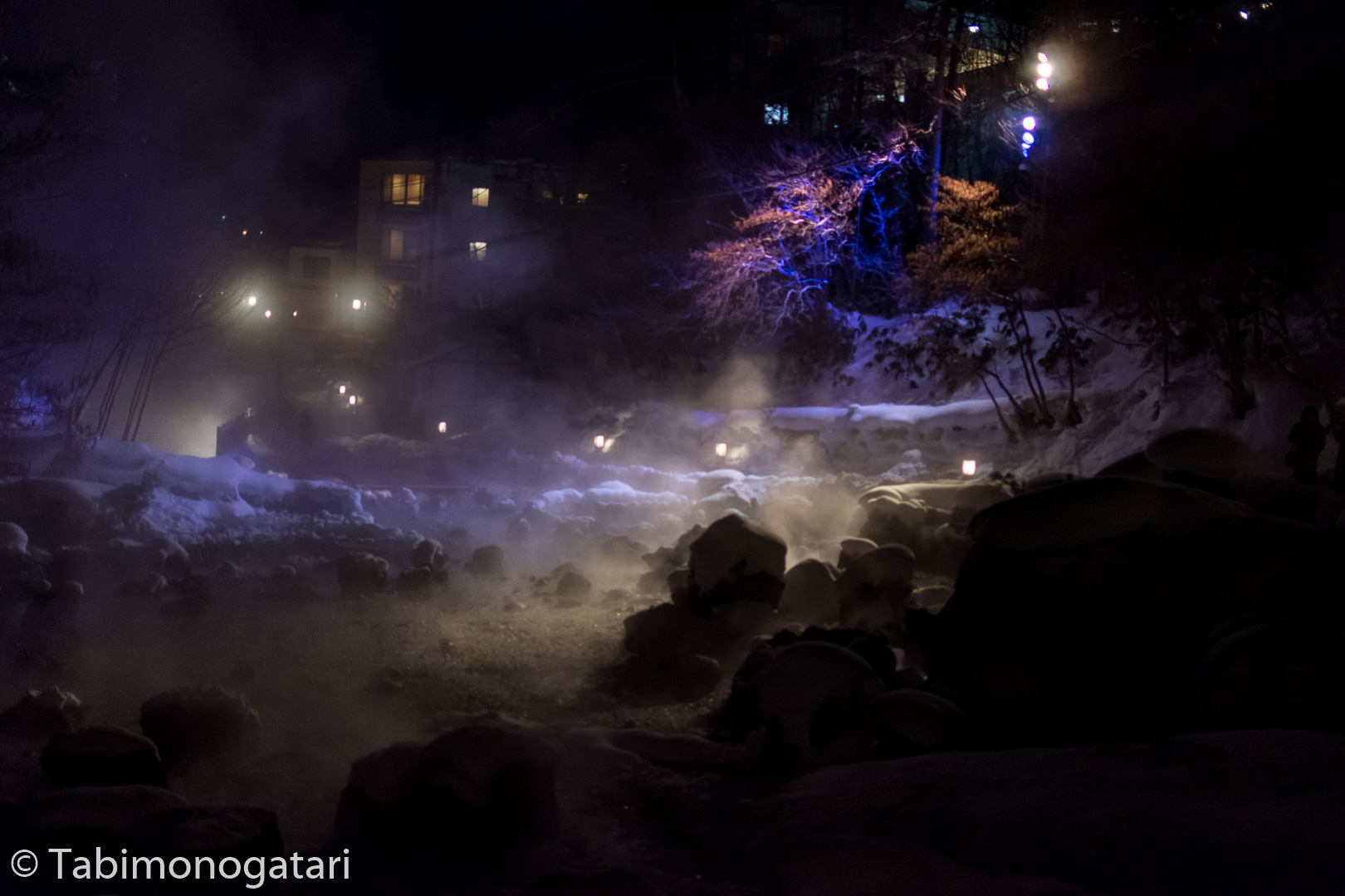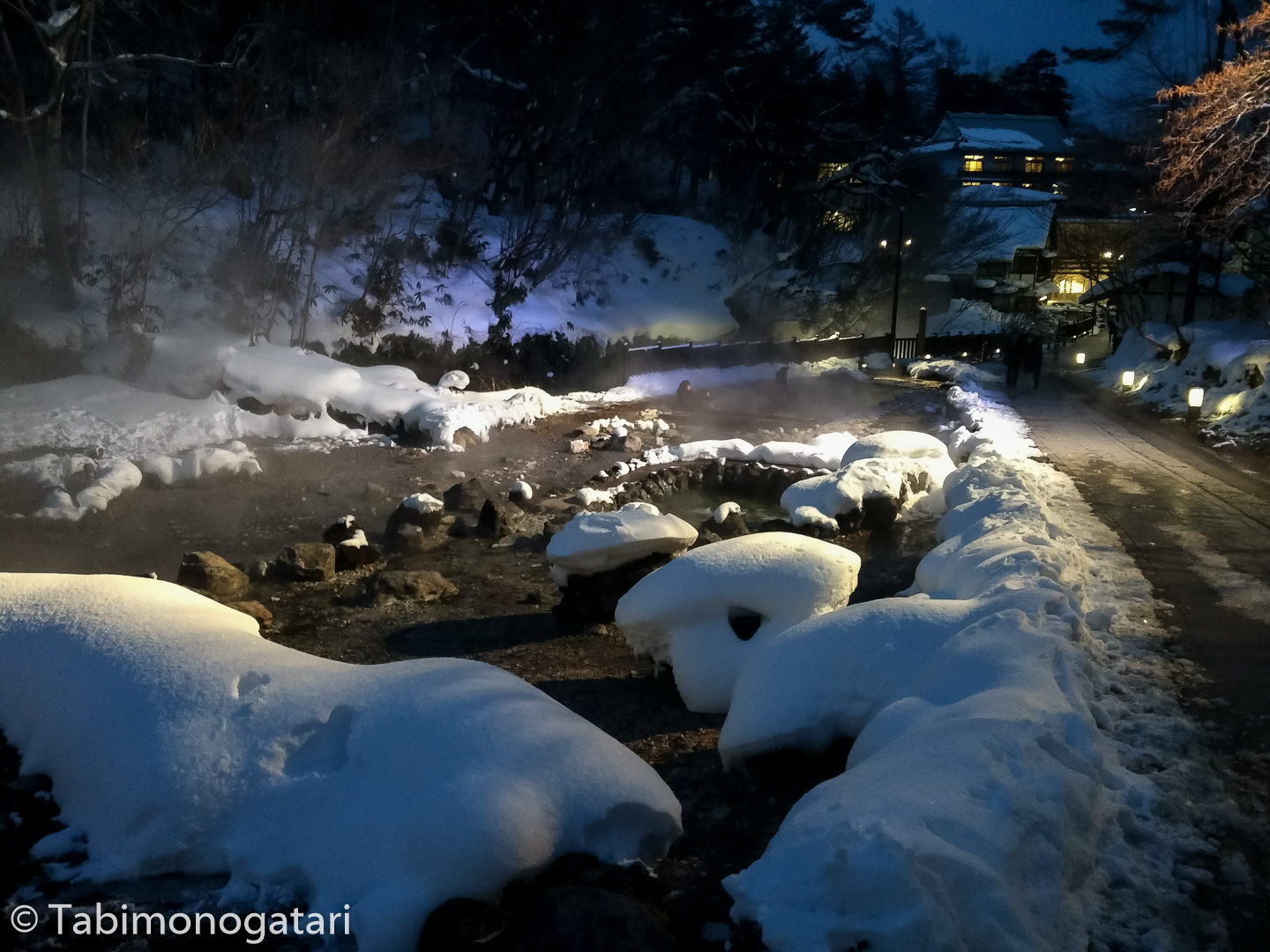Next, we walked through the city to the West to reach the Sainokawara Park leading up to the Sainokawara open air bath. Following the course of the steaming river we walked through the illuminated park. The scenery was indescribably beautiful, so I like to show you pictures instead.