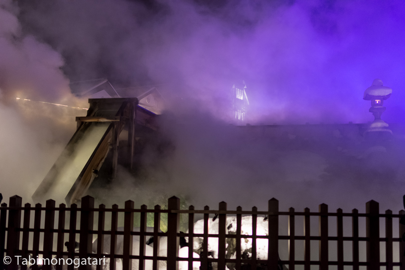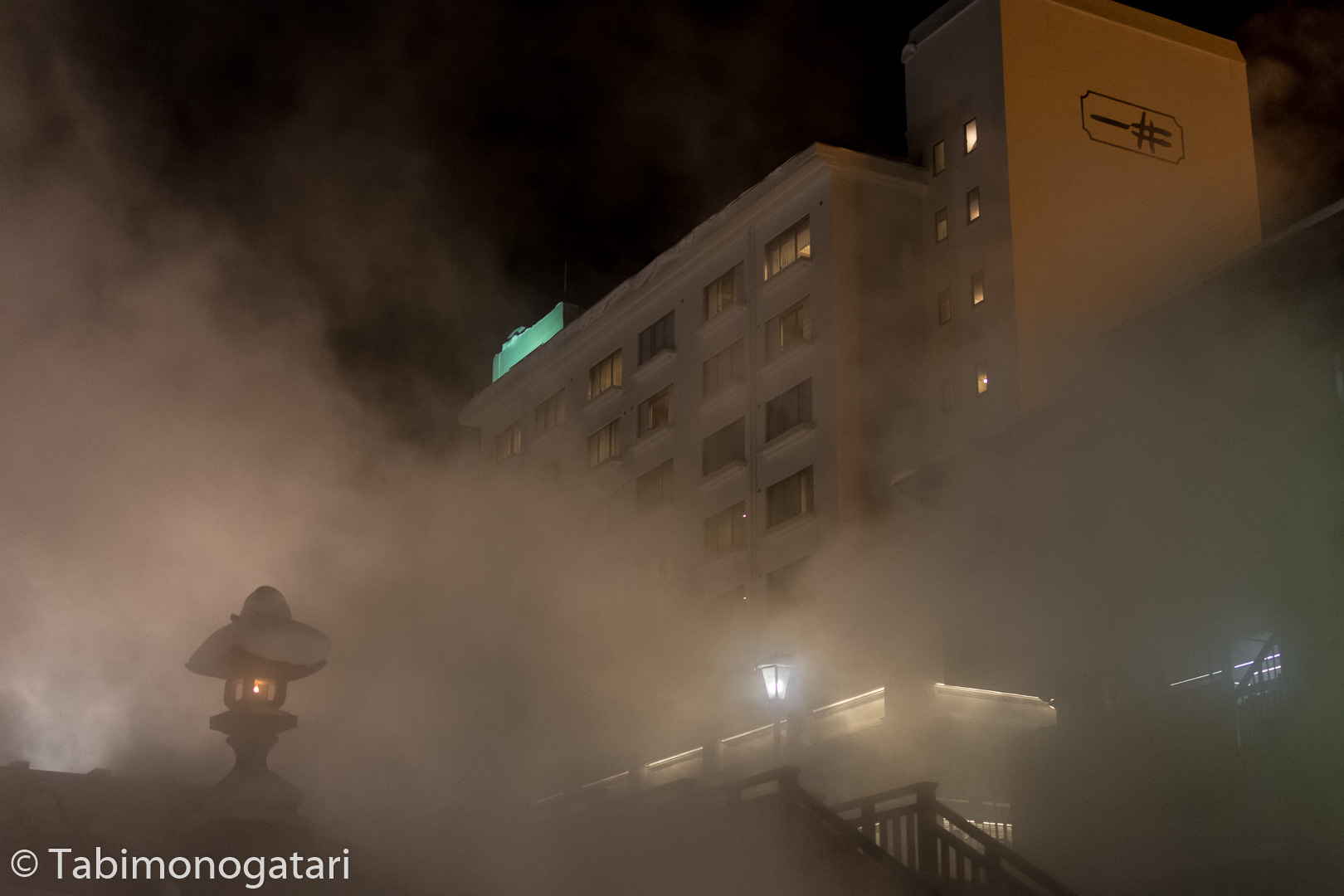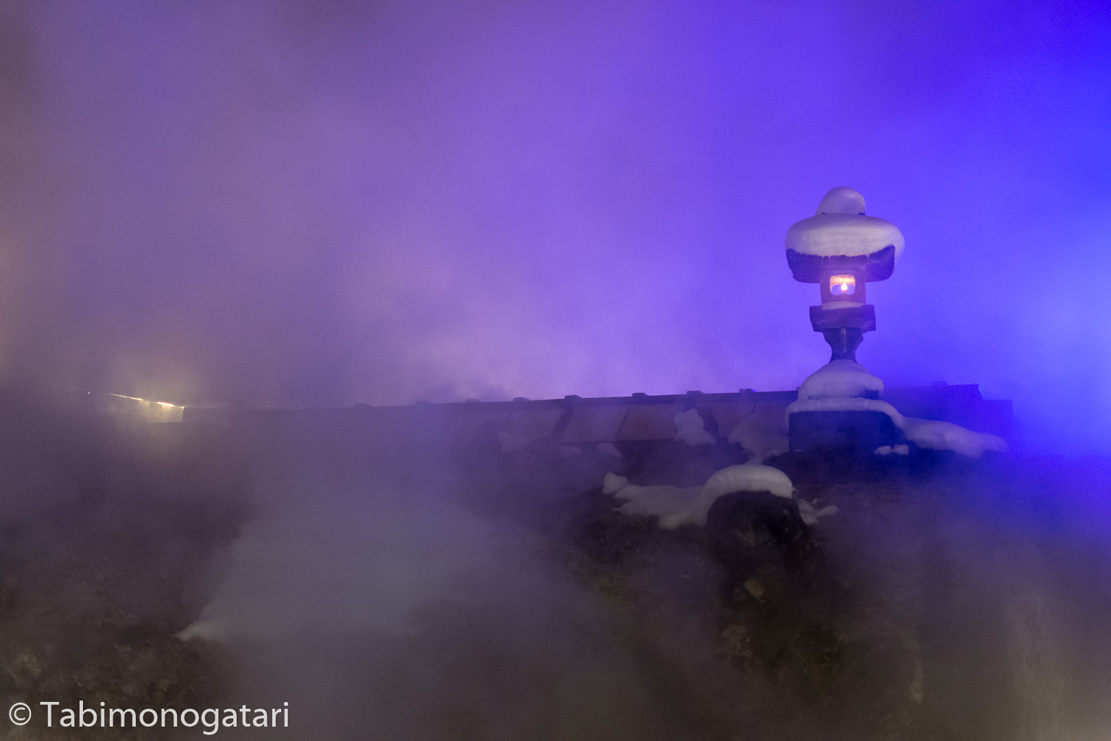 Next, we walked through the city to the West to reach the Sainokawara Park leading up to the Sainokawara open air bath. Following the course of the steaming river we walked through the illuminated park. The scenery was indescribably beautiful, so I like to show you pictures instead.