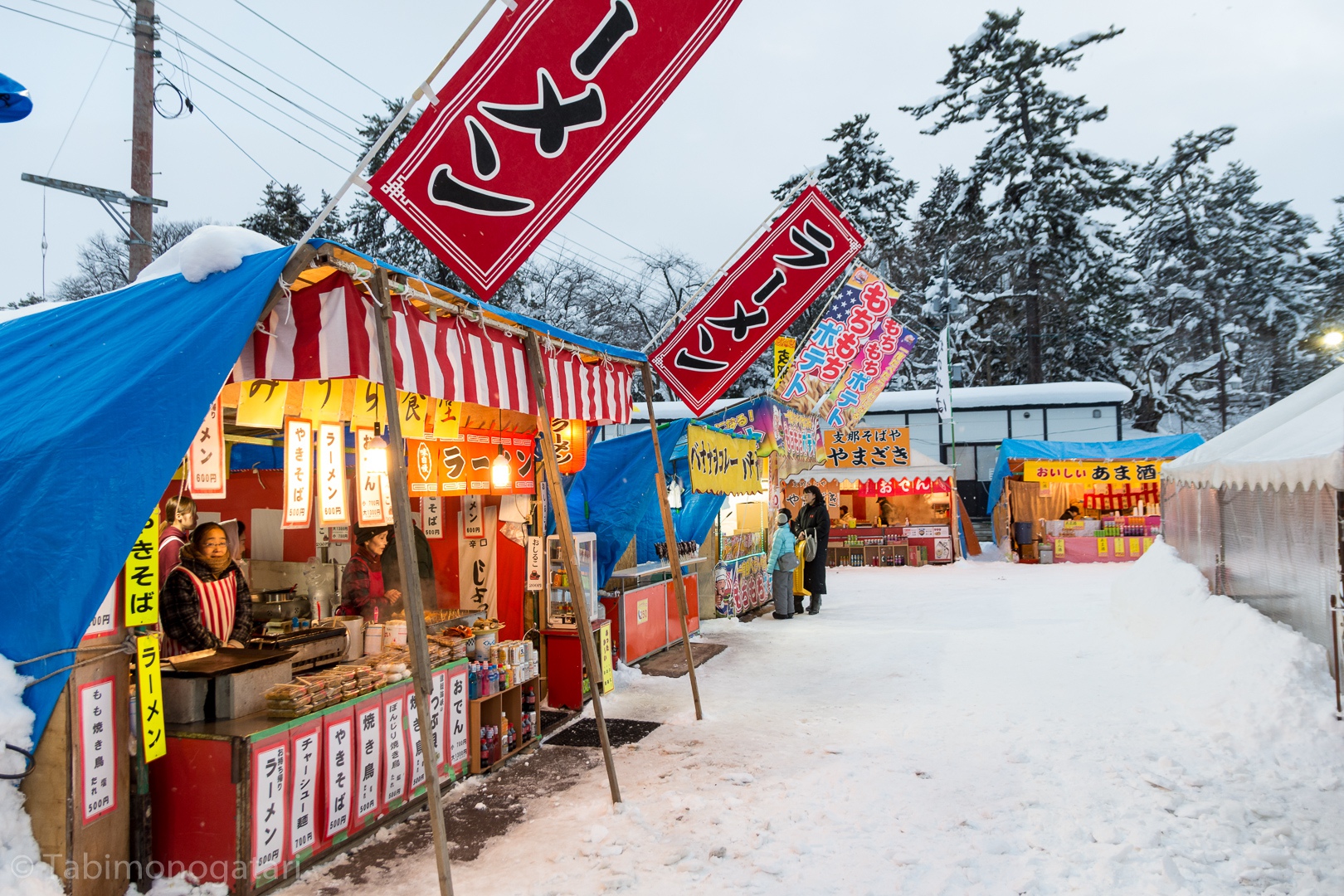 Around these days, the Hirosaki Snow Lantern Festival took place, this was the major reason for me to come today. In the northern corner of the park there was a snow festival with an ice sculpture and yatai food stalls. Many offered hot staples like ramen and oden and also yakiika, karaage and corn dogs. With a portion of oden I sat down in a tent in front of a heater and warmed myself up while I waited for the sun to set.