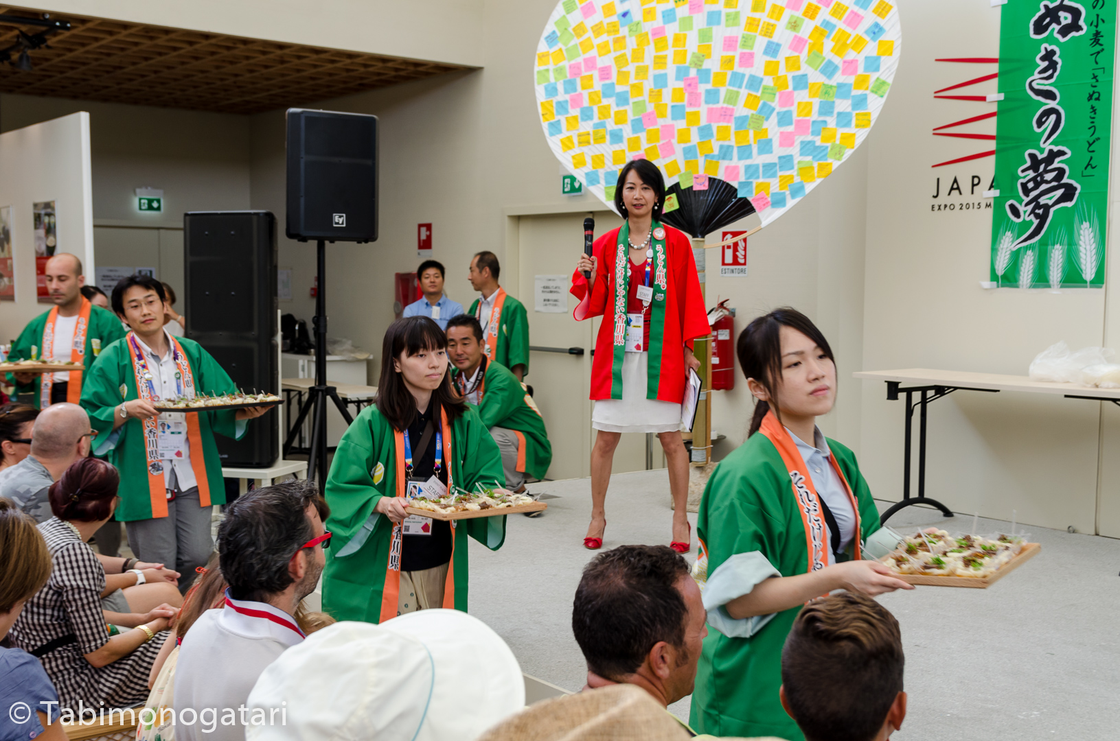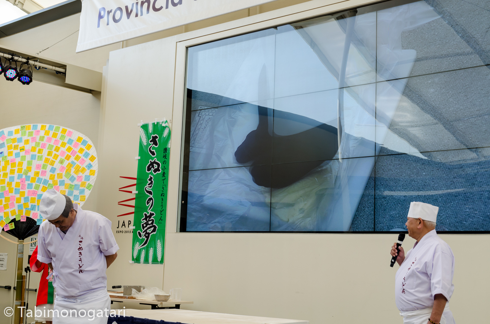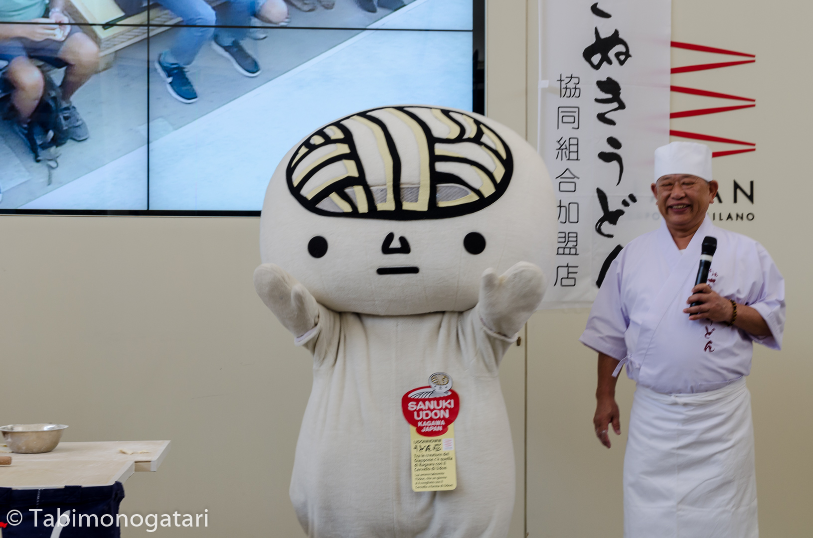 Bevor der eigentliche Rundgang begann, schaute ich mir im Japan Pavillon ein regionales Event an. In dieser Woche hatte die Präfektur Kagawa auf der Insel Shikoku die Ehre, sich und ihre Küche den Besuchern vorzustellen. Ein Koch zeigte uns, wie Udonnudeln hergestellt werden. Natürlich durfte auch ein passendes Maskottchen (うどん脳) nicht fehlen.