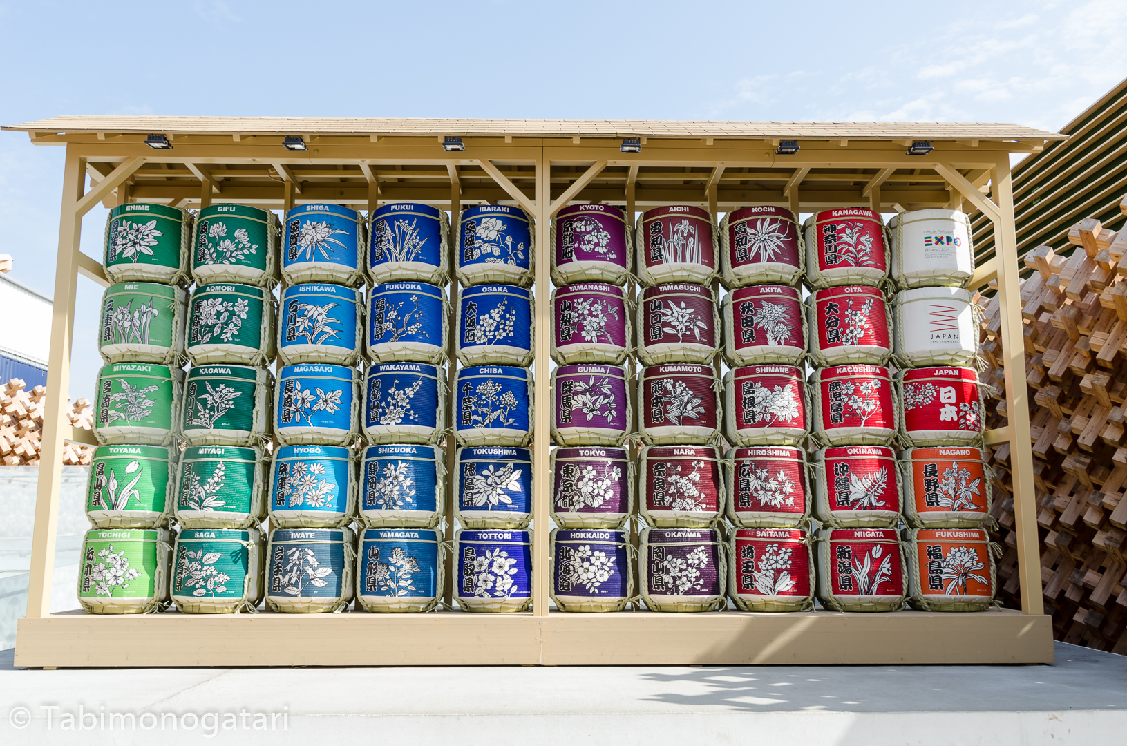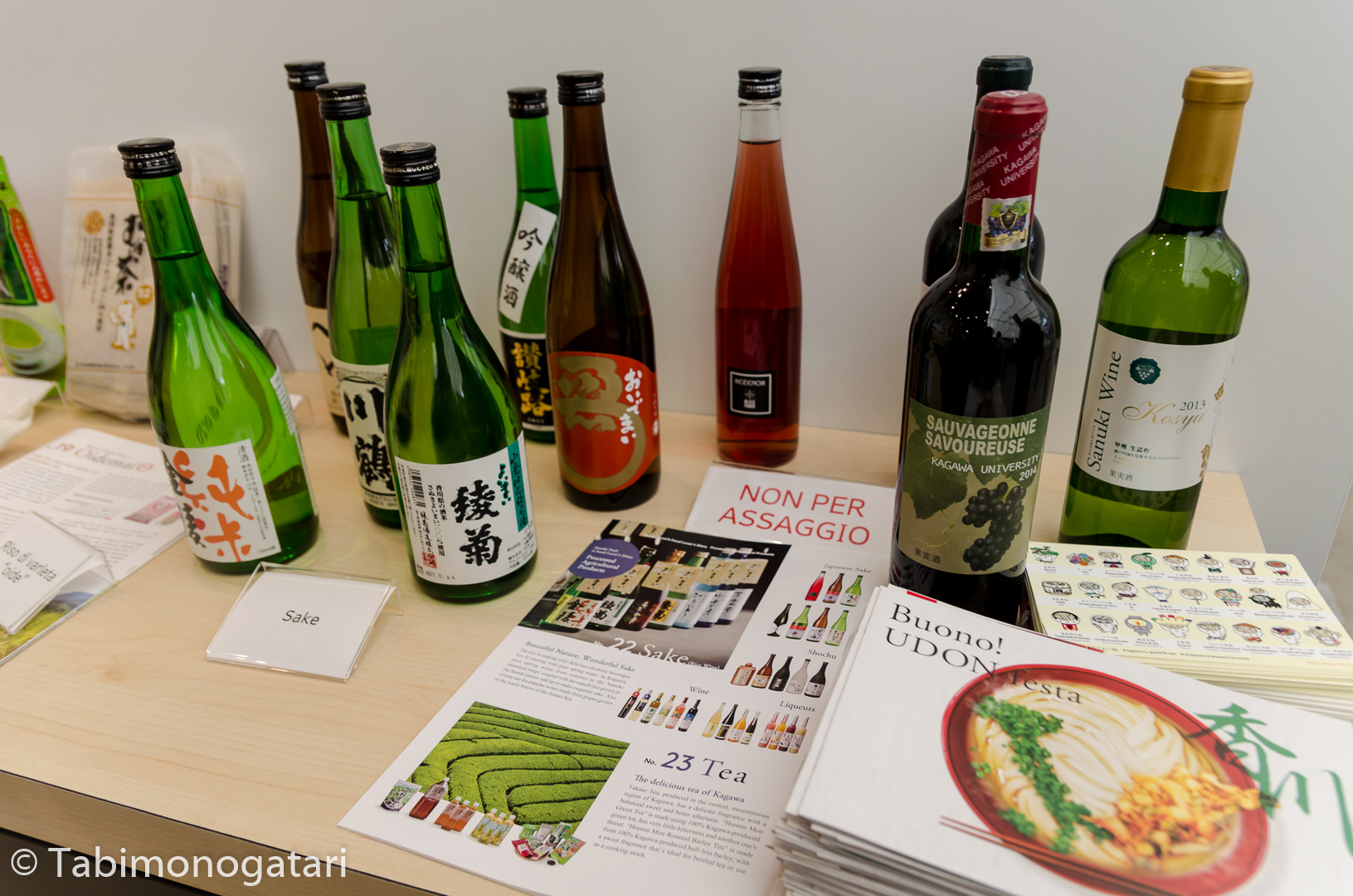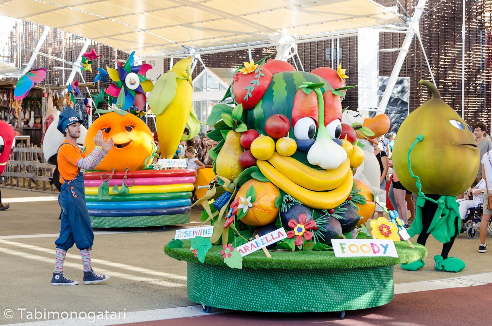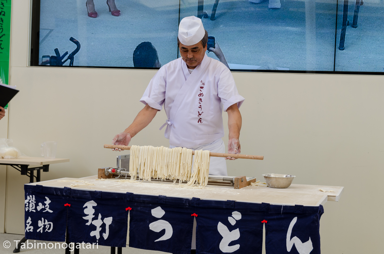 Bevor der eigentliche Rundgang begann, schaute ich mir im Japan Pavillon ein regionales Event an. In dieser Woche hatte die Präfektur Kagawa auf der Insel Shikoku die Ehre, sich und ihre Küche den Besuchern vorzustellen. Ein Koch zeigte uns, wie Udonnudeln hergestellt werden. Natürlich durfte auch ein passendes Maskottchen (うどん脳) nicht fehlen.