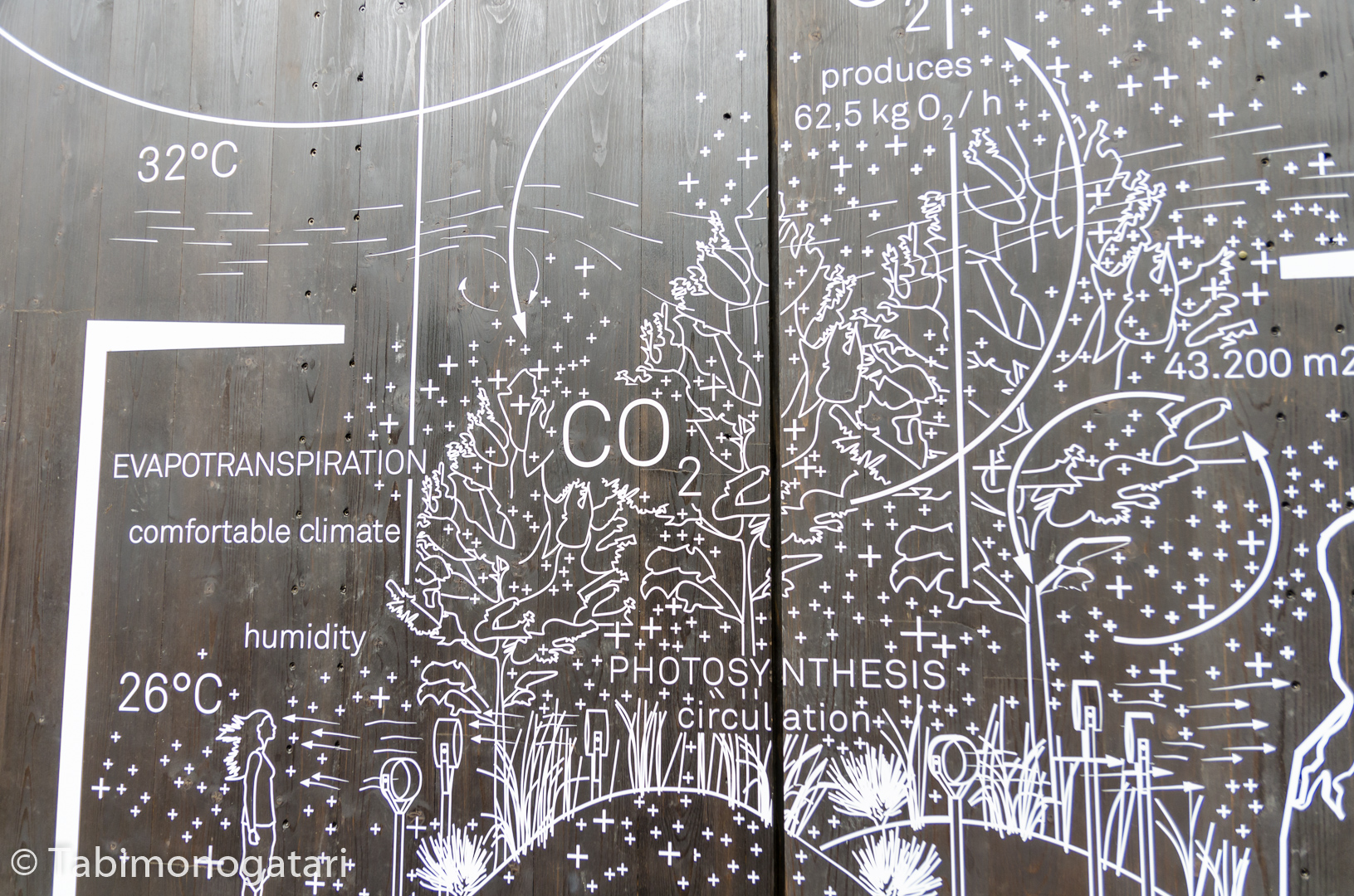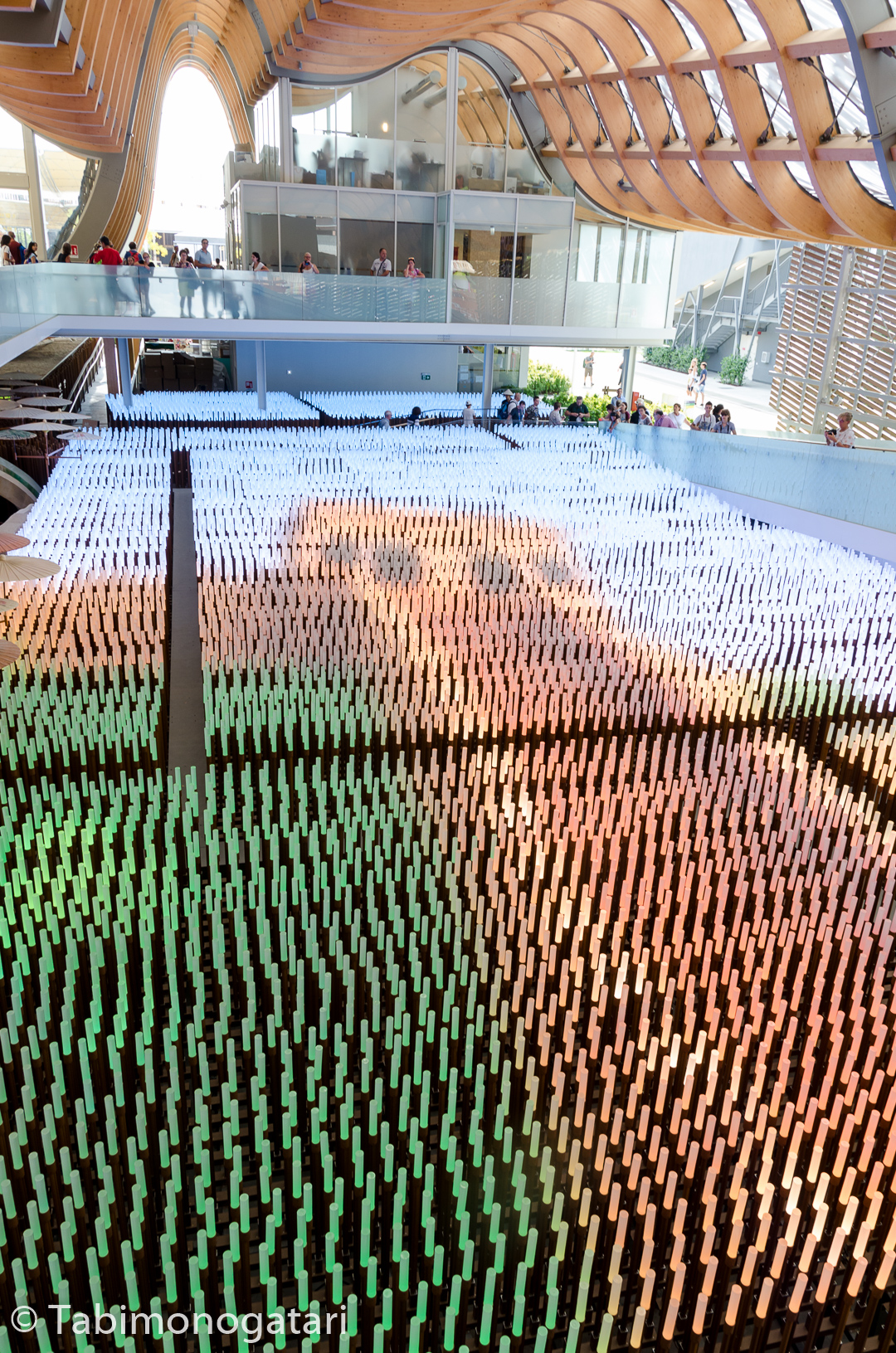 Klar, ich bin hier stark beeinflusst, wenn ich das schreibe, aber mir gefiel der Deutsche Pavillon fast am Besten. Noch in der Schlange bekam man einen „Pappdeckel“ ausgeteilt, je nach Sprache mit unterschiedlichen Löchern versehen, der im Inneren seine Verwendung preisgeben würde. Im ersten Raum wurde die Funktionsweise des sogenannten „SeedBoards“ erklärt und man wurde in die Entdeckerlandschaft entlassen. Unzählige Stände luden zur Interaktion ein, begleitet mit Infotafeln in drei Sprachen. Hielt man sein Kartonbrettchen auf eine Projektion, wurde sofort eine Animation oder ein Video in der eigenen Sprache gezeigt. Zu Beginn wurden wir darauf hingewiesen, maximal drei pro Station gleichzeitig zu verwenden, aber dies geriet schnell in Vergessenheit, während sich manche Besucher wunderten, wieso das blöde Ding denn jetzt nicht tut. Vorgestellt wurden allerlei Naturphänomene und deren Anwendung sowie Ideen und Umsetzungen zu den Themen Lebensmittelanbau und Ernährung. Weiter luden ein (echter) Kräutergarten und eine interaktive Küche zum Entdecken und Schnüffeln ein. Am Ende gab es eine interaktive Show unter dem Motto „Be(e) active“, bei der sich alle in einem kreisförmigen Saal im Stehen versammeln sollten. Zwei Männer stimmten Stück für Stück ein Lied an und zeigten, wie man mit seinem Pappkarton diverse Geräusche machen konnte (denn die Rückseite war geriffelt). Im Laufe der Vorführung stimmten alle mit ein und im ganzen Saal entstand eine warme Atmosphäre der Zusammenarbeit; und das ganz ohne Sprache. An der Decke hingen derweil zwei Monitore, die die Welt aus der Bienenperspektive zeigten, passend zum Thema.
