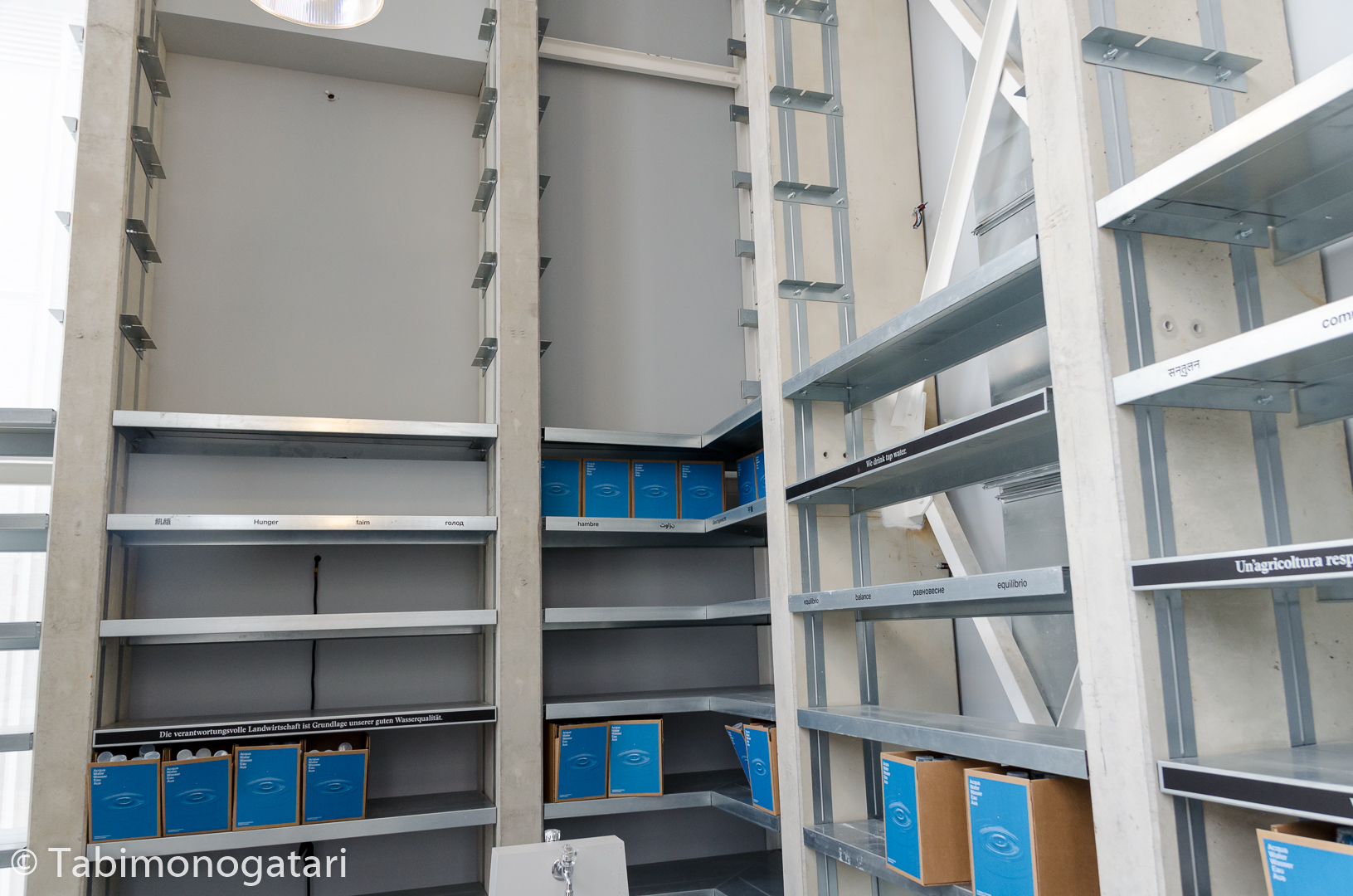 Von einem Schindler Aufzug empor gehoben wurden wir im zweiten von ehemals vier Stockwerken empfangen. Wie kann das sein? All die Verwirrung hängt mit dem Konzept des Turms und der dahinterliegenden Nachricht zusammen. Der Turm besteht aus vier Räumen gefüllt mit kleinen Päckchen. Nach dem Motto „Es hät, solangs hät“ können sich die Besucher nach Belieben an Salzpäckli, Pulverkaffee, Wasser (aus Bechern) und Apfelringen bedienen. Ich muss zugeben, die direkte Verbindung zu den lokalen Gütern der Schweiz teilweise nicht auf Anhieb verstanden zu haben. Aber ist es nicht offensichtlich, dass Pulverkaffee und Trinkwasser (aus Italien) zu den Identifikationsgütern der Schweiz zählen? Spass beiseite. Zu meinem Entsetzen stellte ich fest, dass die erste Etage bereits nach einem Monat nach Eröffnung der Expo aufgebraucht war. Wenn auch nur ein Gut aufgebraucht ist, fährt der Boden ein Stockwerk tiefer; nachgefüllt wird nicht. Die Frage, die sich hier stellte war, inwiefern die Besucher bereit sein würden, zu teilen oder ganz zu verzichten. Und ausserdem, schaffen wir es bis zum letzten Tag? Ich betrat den Turm im zweiten Stock von ehemals vieren, danach kommt nur noch ein Stockwerk – dann ist leer. Aktuelle Hochrechnungen schätzen, dass die Apfelringe der aktuellen Ebene in zwei Wochen aufgebraucht sein würden. Ich konnte nach viel Überzeugungsarbeit ein Schweizer Ehepaar davon überzeugen, eine Packung mit mir zu teilen. Quo vadis?