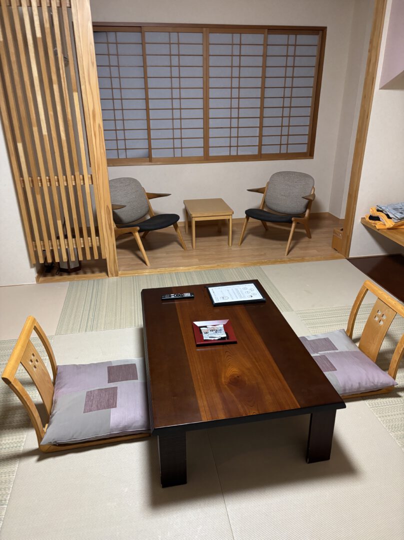 When we arrived, four pairs of slippers were already prepared, and the receptionist kindly explained the facilities and offerings of the ryokan. Given the timing and the weather, it felt like we might have been the last guests to arrive that day. The ryokan had one large main bath, a smaller secondary bath, and a natural steam-powered ondol hot stone experience, which we could sign up for and which I would come back to later. This time we had two separate rooms, both very traditional and surprisingly warm, apparently thanks to a heating system that directly uses natural hot spring water.