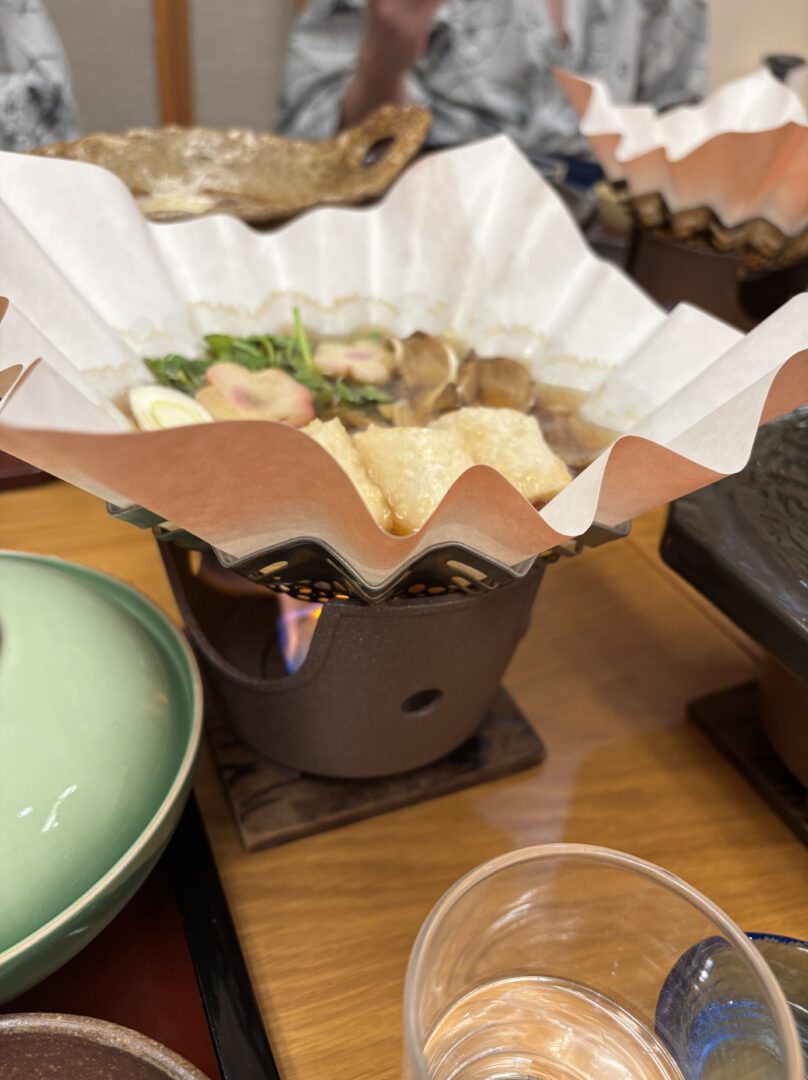 We had enough time to take a soak in the onsen before dinner, and we were immediately impressed by the sheer scale of the bathhouse. When we opened the door, we stepped into a dim wooden space filled with steam, with several pools spread across the room, including a whirlpool, a sauna, and a hot box with a steam outlet where you could enjoy a personal steam session. The large bath contained multiple pools as well as small steam saunas designed for one person at a time. Sitting inside one of these wooden chambers while steam rose from below felt like a quiet, contained way to warm up without fully bathing. The water itself was a milky white color, and the steam was so thick it was visibly foggy. Funnily enough, there were no shower heads, only a water faucet at a bowl, which you used to pour hot or cold water over yourself. After moving between the different pools and spending enough time soaking, it was time for dinner.