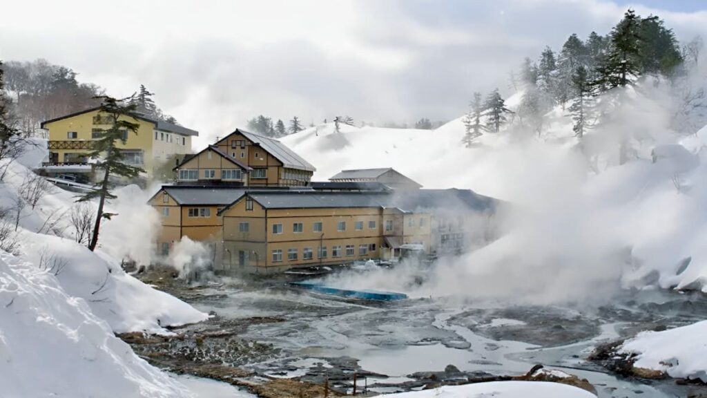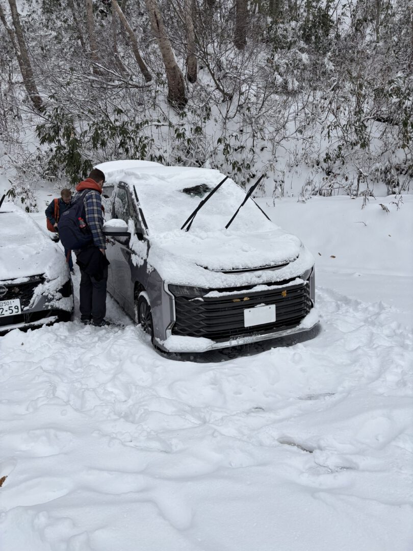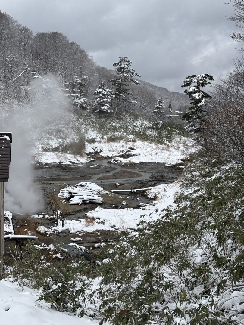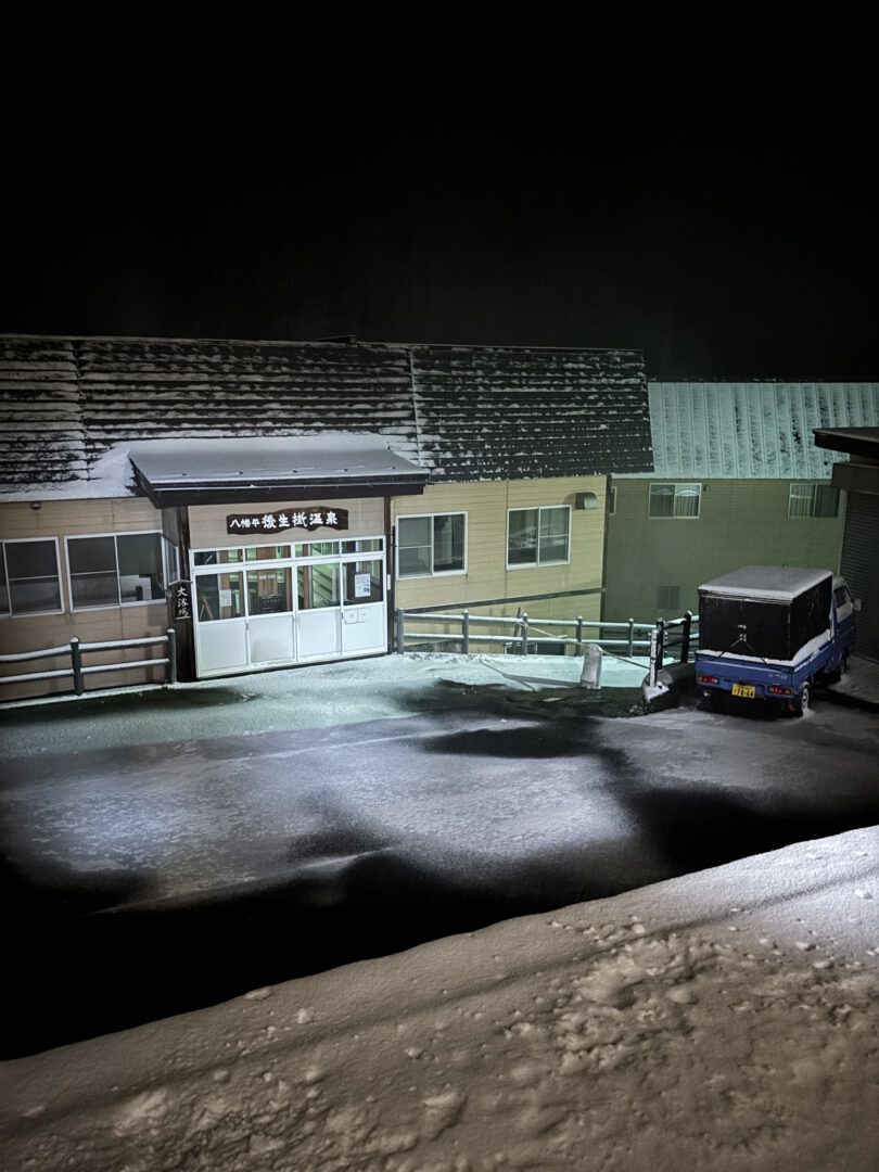 At one point we barely avoided oncoming traffic when we came dangerously close to a truck on a narrow stretch of road. As we approached our destination, the roads climbed higher and the snowfall grew heavier, and we started to worry whether we might need snow chains after all. We stopped briefly to test traction, but the winter tires held well and gave us enough grip to continue. As it kept snowing and the last light of the day faded, we finally arrived at Goshogake Onsen. With it came the unmistakable smell of sulfur. We arrived in the late afternoon, with temperatures already well below freezing.
