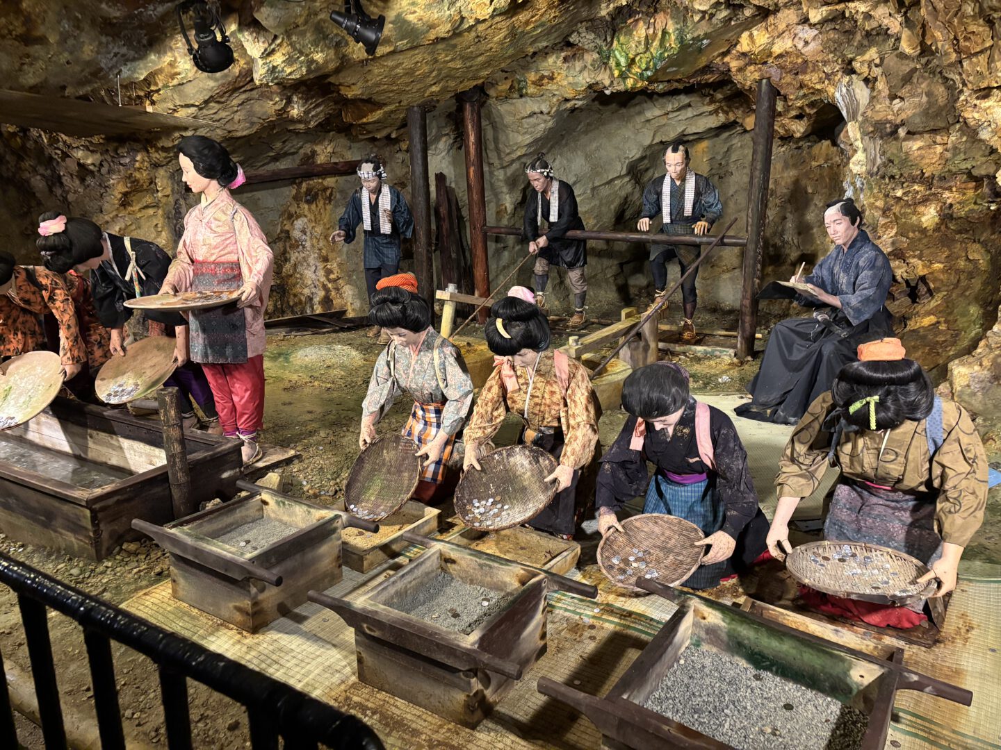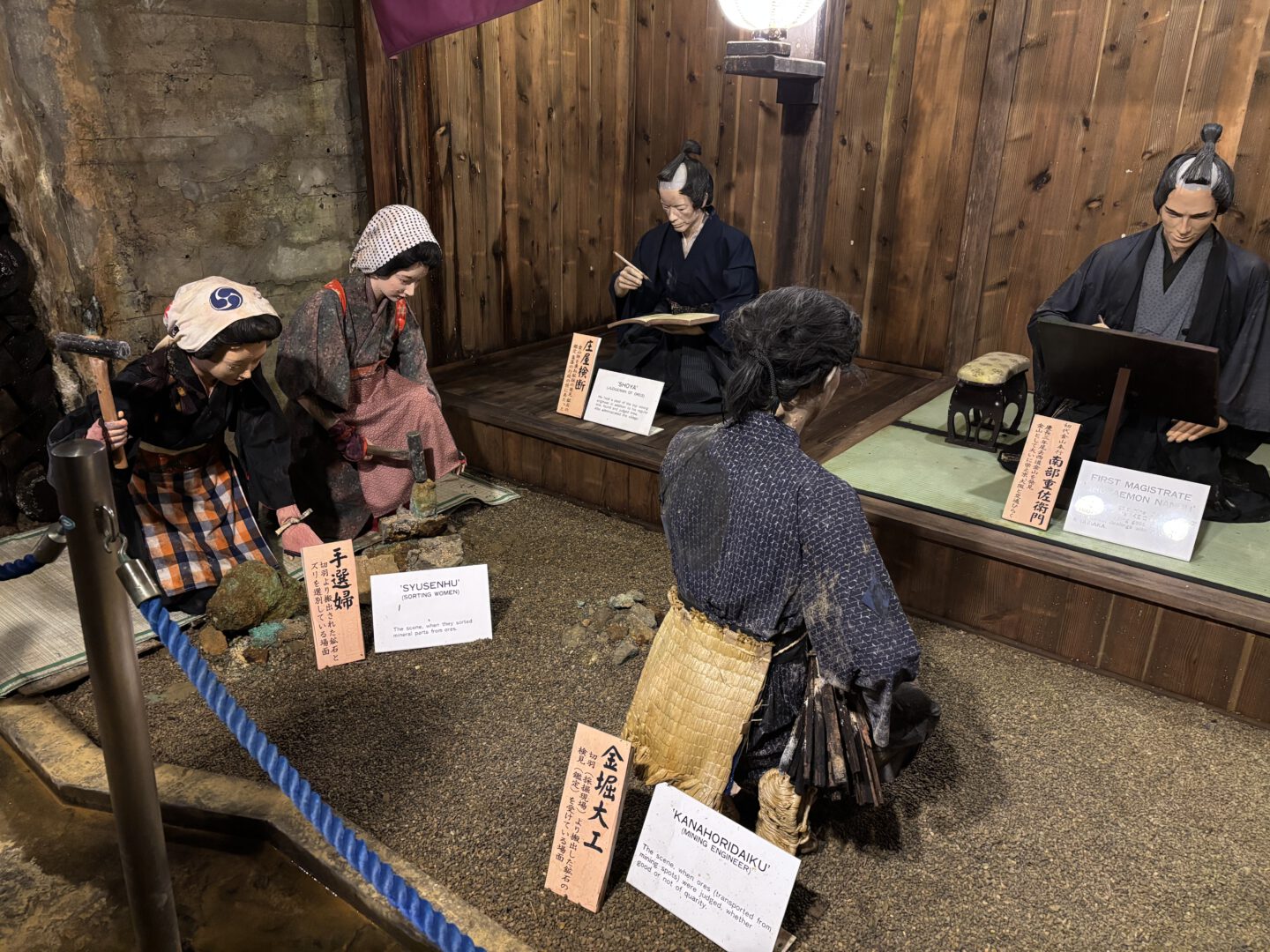 Exhibits recreate mining scenes with mannequins and historical equipment, and information panels explain how mining shifted from gold in earlier periods to copper later on. It is said that gold from this mine was used for the Great Buddha of Todai-ji in Nara and the Golden Hall of Chuson-ji in Iwate, a thought that lingered in the moist, earthy air as we walked through the tunnels. The steady silence and low temperature made it easy to imagine how hard and dangerous this work must have been.