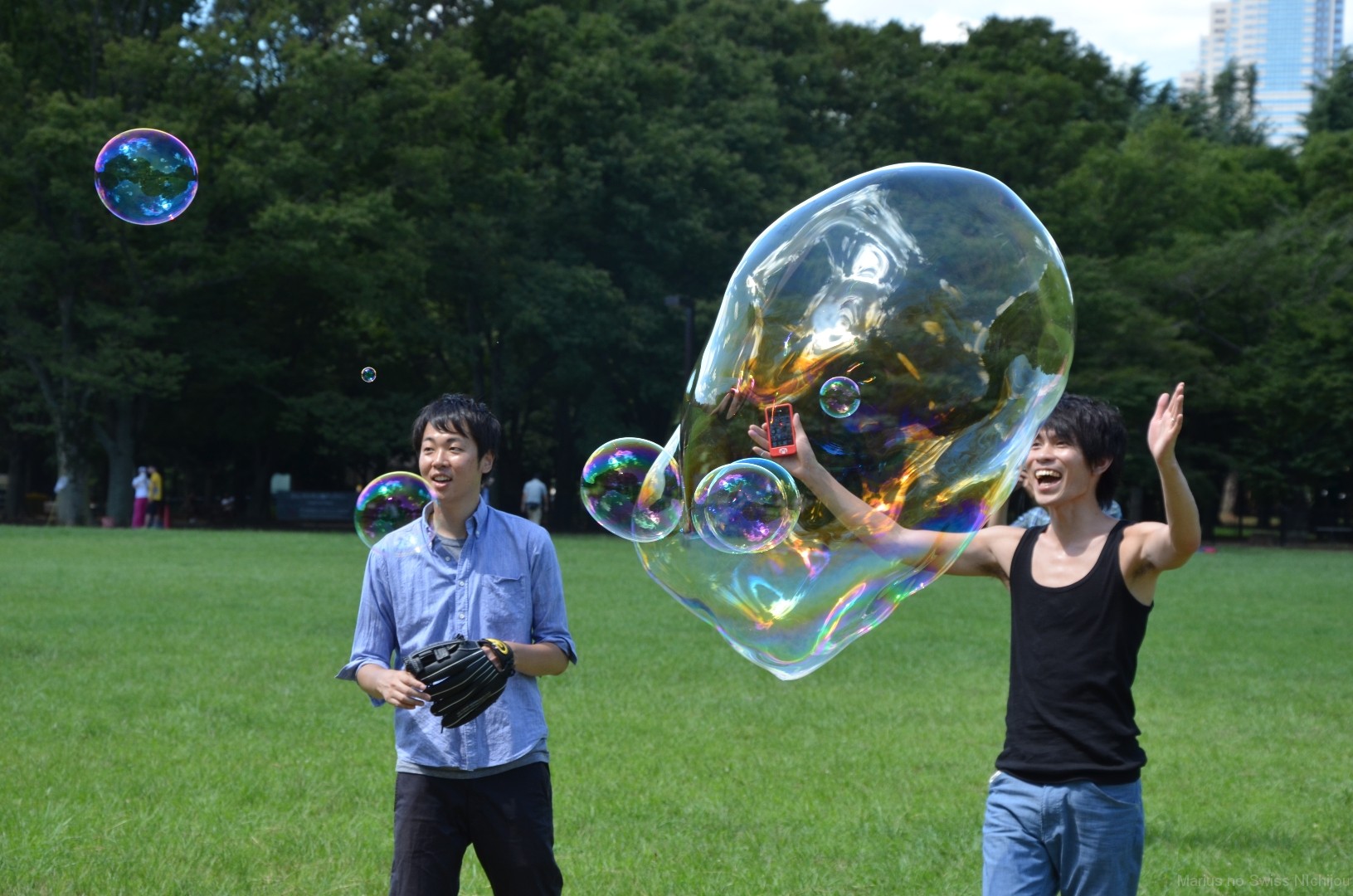 Von da aus erkundete ich auch den Rest des Parks. Es war einiges los, viele Leute saßen unter Bäumen und auf Wiesen, einige Unterhaltungskünstler waren da und manche amüsierten sich, indem sie versuchten zu acht synchron Seil zu springen – oder bliesen Seifenblasen in die Luft.