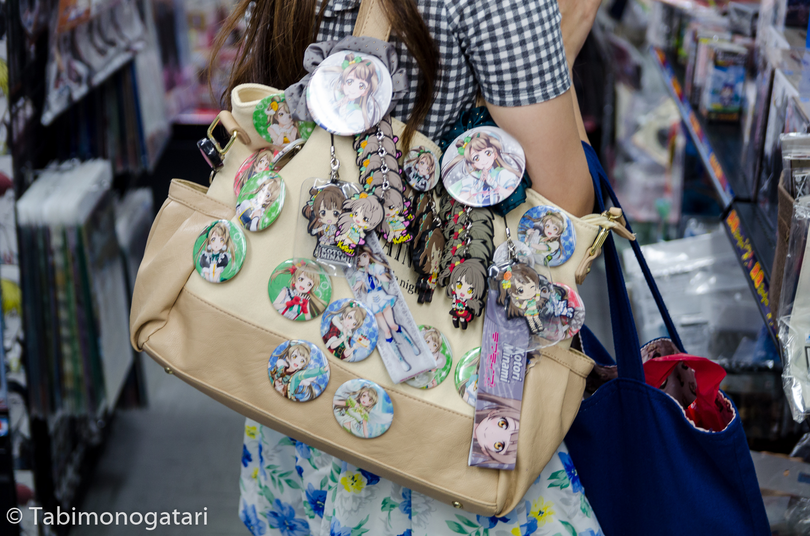 The anime Love Live is currently extremely popular in Japan. Very enthusiastic fans decorate their bags (and even themselves) with character goods to show their love for the character.